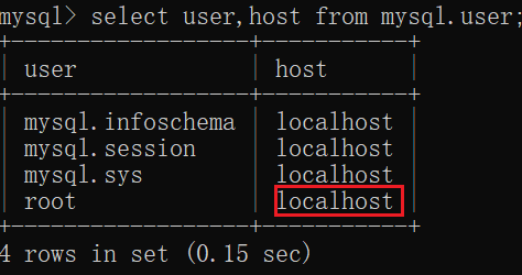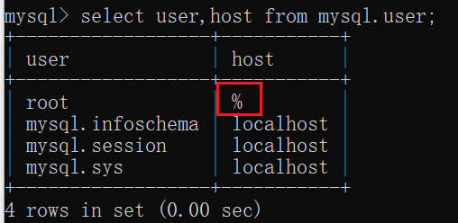 4、更新用户权限,修改root用户的host字段(允许任意远程主机(用 ‘%’ 表示)进行连接